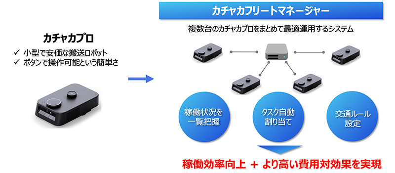 「カチャカリートマネージャー」は、小型搬送ロボット「カチャカプロ」を複数台同時に最適運用し、交通整理と配車管理を通じて、稼働効率の向上と費用対効果の最大化を支援する統合管理システムだ。